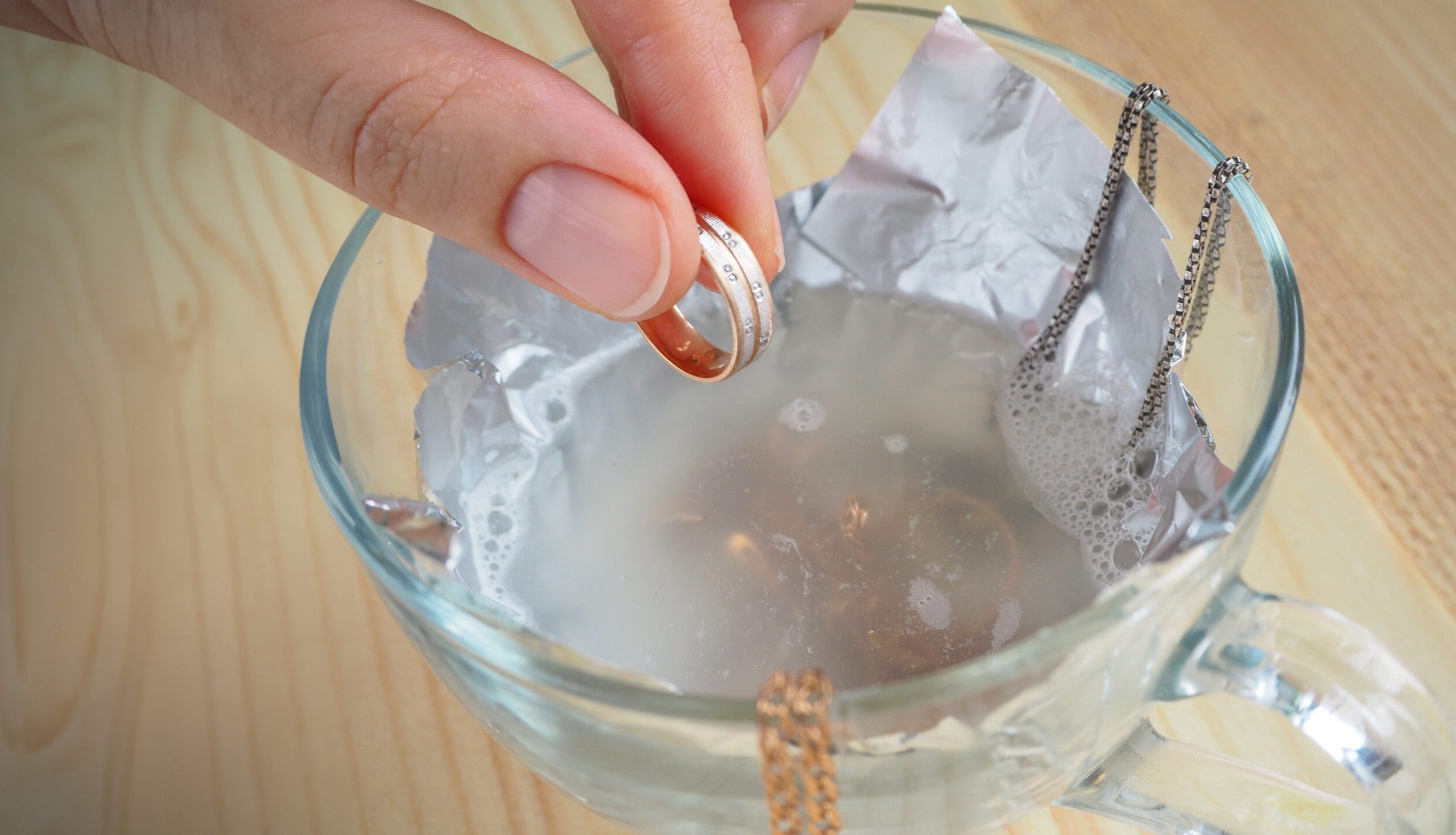 - Замочіть прикраси: Опустіть золоті вироби в розчин і залиште їх на 30 хвилин. Це допоможе розм’якшити наліт і бруд.
